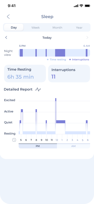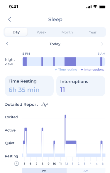 Observe how your pet’s activity and rest patterns progress over time, how they compare to their baseline (established during the first week of use and updated regularly) and to their ideal daily amount of activity (personalized according to their individual characteristics).