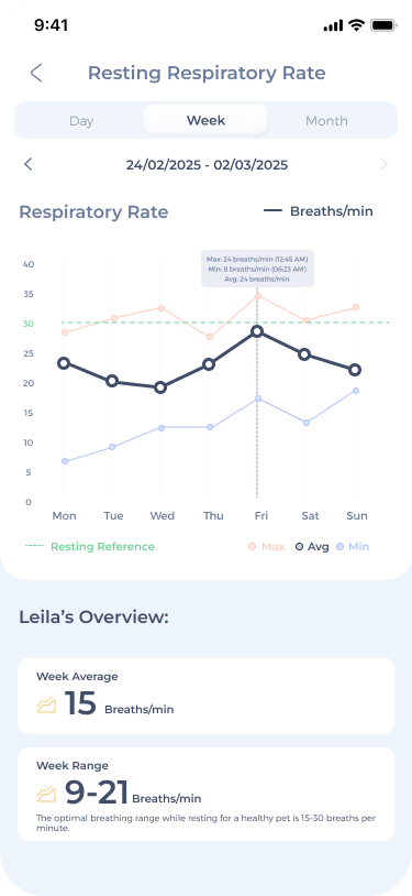 Maven can support at-home monitoring by tracking resting respiratory rate and heart rate trends and helping you spot any changes earlier. It’s not a replacement for veterinary care, but it can help you stay consistent between checkups.