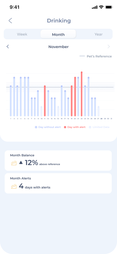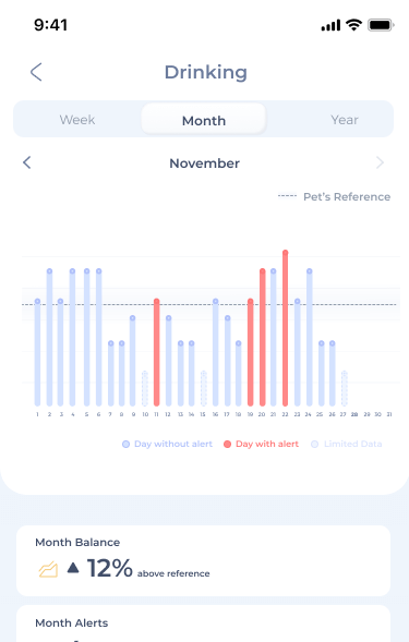 Keep up with your dog’s drinking behavior! Maven will notify you if their drinking levels are increasing or decreasing, and continuously compare them to the dog’s baseline. Any deviations are flagged quickly and in their early stages, allowing you to act promptly if needed.