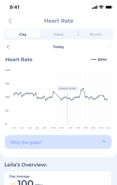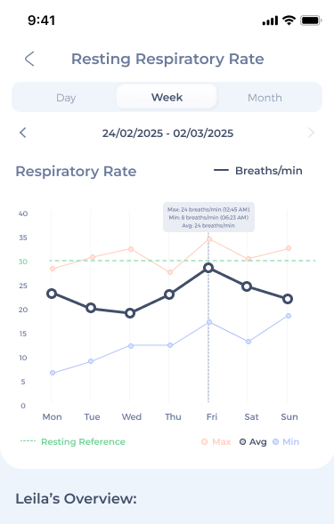 Maven provides accurate and continuous resting respiratory rate monitoring, which is often one of the earliest indicators of health problems. Even subtle changes can hint at respiratory issues or serious conditions like heart disease, anxiety, or infections, so it’s an essential metric!
